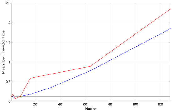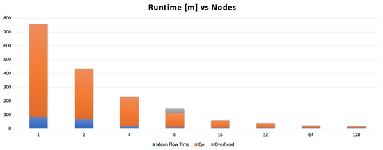 A bird’s eye view of the benchmark’s runtime is presented in Figure 4 to underscore the overhead of calculating the mean flow at higher numbers of nodes. It shows three distinct runtimes, including the mean flow’s calculation, other flow statistics, and an overhead which we define as the simple difference between the sum of the core runtime and the overall runtime. To enrich the visualization of these results, we also present the proportion of the time invested in the mean flow to the time required to generate all other flow statistics in Figure 5.