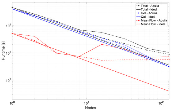 The scaling performance for the second portion of the benchmark is considerably better with nearly linear scaling throughout the test and slightly super-linear scaling towards 128 nodes. We combine these results into a single plot to provide some context to the critical nature of the mean flow path at higher node counts and show the results in Figure 7. Removing the mean flow calculation from the benchmark yields a runtime remarkably similar to that presented in Figure 8.