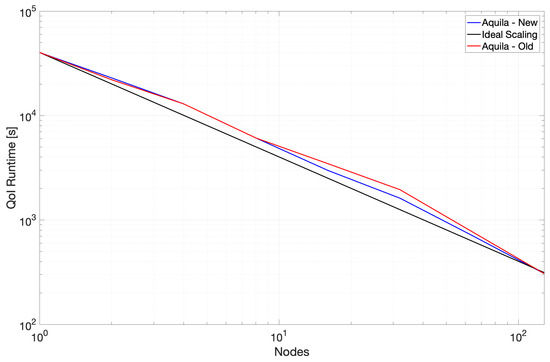 We present strong scaling data for two revisions of the Aquila C++ implementation (denoted Old and New in the figures for clarity). Old scaling data show results where vectorization was sub-optimal in some of the fundamental operations. We were unknowingly paying a high abstraction penalty [49,50] in the tight loops consuming the majority of the runtime (at the time, the 3D TPC). The Intel compiler could not optimize through multiple layers of abstraction, starting on the higher-level distributed volume class down to the Kokkos parallel loop abstractions. Noting that the generated x86 code was mostly scalar and had a few SSE instructions, we rewrote the TPC kernel using AVX2 intrinsics to assess the impact of the lack of vectorization (as mentioned in Section 2.3) and noted a dramatic performance improvement.