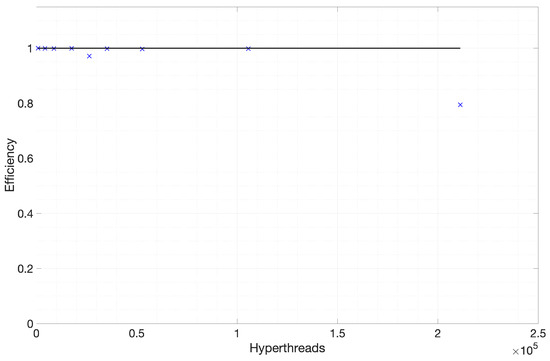 Figure 9. Parallel Efficiency vs. the Number of Total Hyperthreads. (taken from [22]; reprinted by permission of the American Institute of Aeronautics and Astronautics, Inc.)