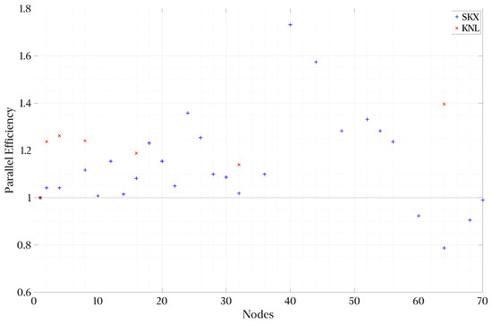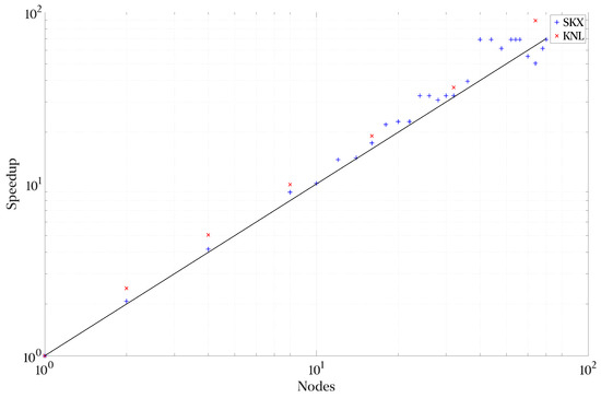 For the Python V2 implementation, we also present a smaller sample using Stampede 2 [43]. Stampede2 has two partitions with a total of 4200 “Intel Xeon Phi 7250” (KNL) compute nodes and 1736 “Intel Xeon Platinum 8160” (SKX). An in-depth discussion of these architectures is outside the scope of this work; however, ref. [43] provides more information on both CPU architectures. The nodes are interconnected through a 100 Gb/s Intel Omni-Path network with an oversubscription factor of 7:5 for the compute nodes and full non-blocking connectivity for the I/O nodes. It is worth highlighting the different features between the SKX and KNL nodes regarding storage: the integration of the network interface card (NIC) within the CPU die for the KNL nodes, whereas the SKX nodes communicate with the NIC through PCIe. The I/O subsystem for the scratch storage is Lustre-based, with four meta-data servers and a total aggregate bandwidth of 330 GB/s. The KNL nodes have 96 GBs of DDR4 plus 16 GBs of MCDRAM as the last-level cache for the individual nodes. For applications consuming more than 16 GBs of memory, the available bandwidth available from main memory is 115.2 GB/s. The Skylake-based nodes offer 119.21 GB/s per socket, which sums to 238.42 GB/s from the main memory. Thus, for memory-bound applications with access patterns not tuned for the MCDRAM cache of the KNL nodes, the higher-frequency and higher-memory bandwidth of the SKX nodes should provide better performance. The on-die NIC of the KNL nodes should translate to a more consistent scaling performance (note: consistent scaling performance and not performance due to reasons mentioned above).