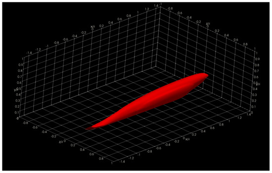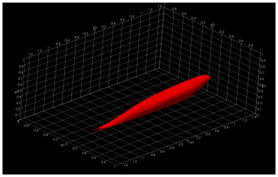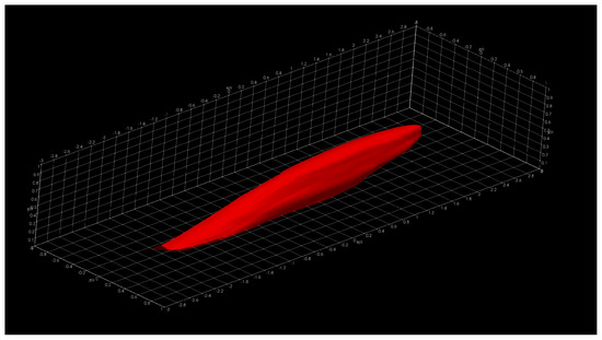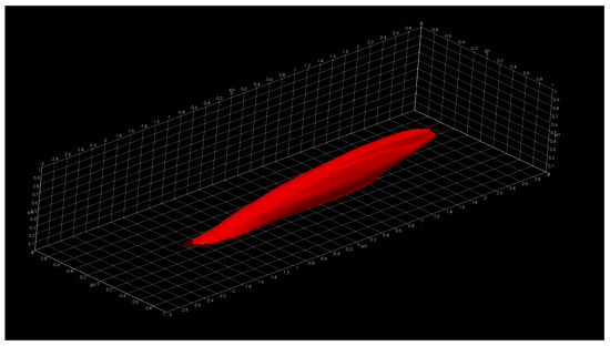 In this section, we show and discuss some results obtained using Aquila in the Onyx benchmark dataset. Specifically, we show three-dimensional two-point correlations (TPC) for the full supersonic High Reynolds number domain for the streamwise velocity fluctuations at y + = 5, 15, 50, and 100 in Figure 16, Figure 17, Figure 18 and Figure 19, respectively. Here, the superscript + indicates inner units in turbulence by dividing the wall normal coordinate, y, into the viscous length scale ν w / u τ . Here, ν w is the wall kinematic viscosity and u τ is the friction velocity defined as τ w / ρ , where τ w is the wall shear stress and ρ is the local fluid density. Note that we present iso-surfaces of the two-point correlation function. The wall-normal coordinates y + were strategically selected in order to analyze coherent structures in the linear viscous layer ( y + = 5), buffer layer ( y + = 15), beginning and middle of the log region ( y + = 50 and 100, respectively). The two-point correlation is emphasized and presented due to its computational intensity. On typical analysis, the calculation of the two-point correlation can account for 57–92% of the total runtime depending on the total number of reference locations.