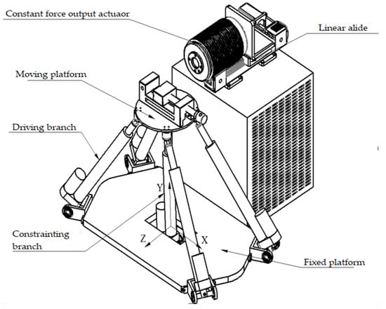 The moving platform is a constant, that is, the z axis coordinate of the center of the moving platform is a fixed value, indicating that the parallel robot constrains are moving along the Z-axis (one-degree-of-freedom). The one degree of freedom is constrained by the combined action of the constant force output actuator and the linear slide.