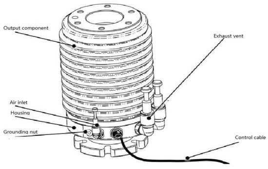 The parallel grinding robot drives the spatial motion of the parts to be ground, and the constant force output actuator provides the grinding force perpendicular to the grinding point. Figure 2 is the schematic diagram of the constant force output actuator, which can provide high-precision constant force output in one-dimensional direction along its axis (i.e., perpendicular to the grinding point plane). During operation, the filtered and compressed air enters the constant force output actuator from the air inlet, and the control cable is connected to the control box of the constant force output actuator. The internal sensor of the constant force output actuator converts the detected internal air pressure into output force data and transmits it to the controller. According to the real internal change in air pressure, the controller regulates the pressure and rate of the air inlet to keep the output force of the output actuator constant.