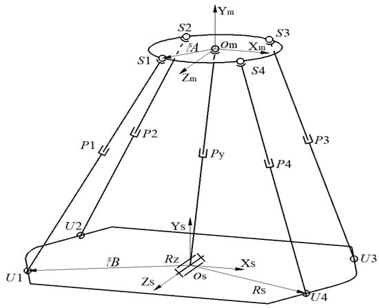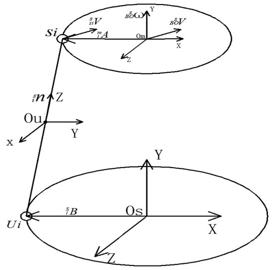 The coordinates of the moving platform center Om in the fixed coordinate system are represented by . As per (2), Equation (7) can be obtained.