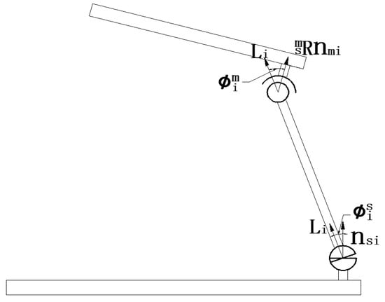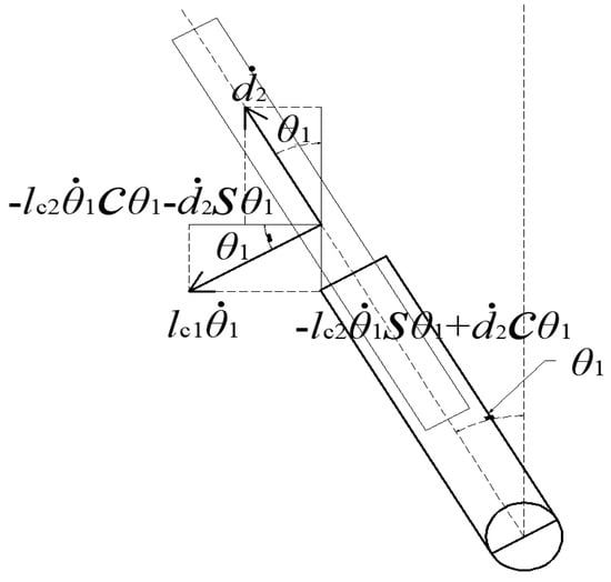 Similarly, coordinate system 1 was chosen as the reference coordinate system, the schematic diagram of linear velocity and angular velocity of the constraining branch’s linear moving link are shown in Figure 9. The relationship between them and the constraining branch velocity parameters is described in Equation (16).