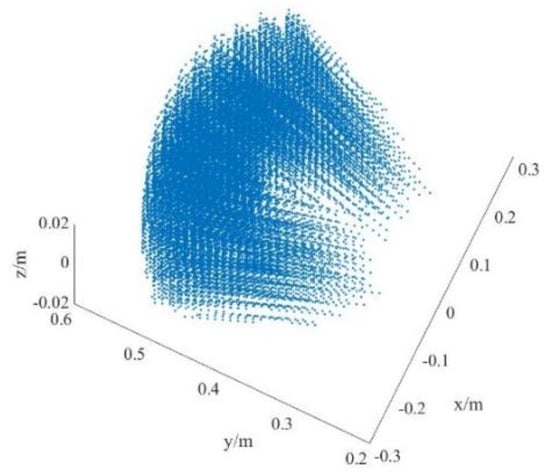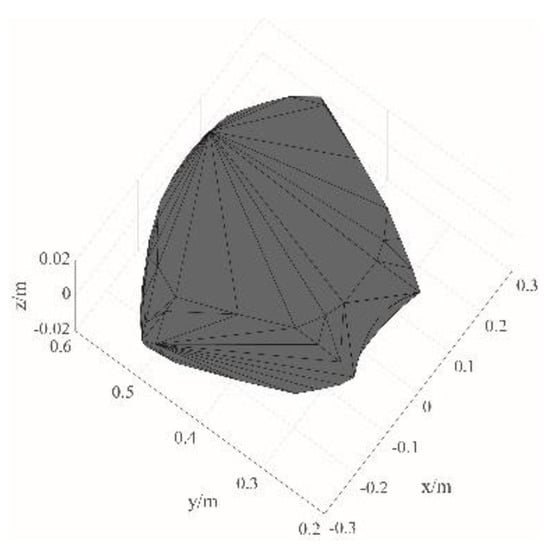 Due to the complexity of the motion of the parallel grinding robot, the spatial analysis of the grinding point of the parallel grinding robot is usually complex, which is generally a nonlinear expression. Some are even implicit expressions. Hence, it is difficult to obtain the numerical solution directly. In this paper, the brute-force search was used to draw the three-dimensional graphs of grinding points. Equation (9) is the constraint condition and the grinding points of (10) are the objective function. The exhaustive method was applied in MATLAB to obtain the three-dimensional scattered-points set meeting the constraint condition, as is shown in Figure 5. All the outermost points in the three-dimensional scattered-points set were taken to form a new set, and then the envelope surface of the gap (inexhaustible points) between adjacent points in the new set is drawn by surface approximation so as to obtain the grinding point workspace of the parallel grinding robot to prevent the dead zone that the parallel robot may not reach when performing tasks, as is shown in Figure 6 and Figure 7.