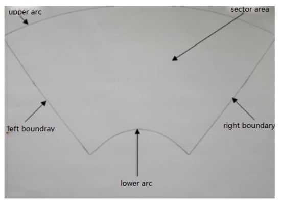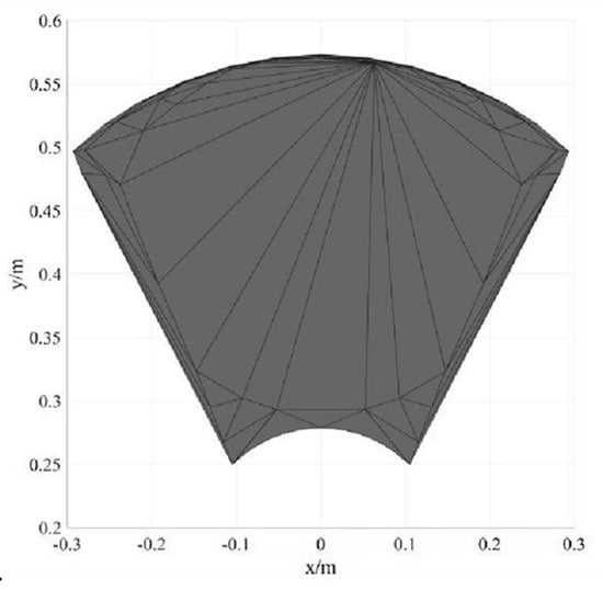 Figure 7 was compared with Figure 23. The comparison showed that the cross section of the workspace of the grinding point obtained through the theoretical analysis was consistent with the shape of the workspace boundary curve obtained through the physical model, indicating the correctness of the theoretical analysis of the pose and position characteristics. As per Figure 23, the cross section of the workspace of the parallel robot’s grinding system model is a circular sector. The upper end of the sector is an arc with a radius of about 0.55 m and the lower end is an arc with a radius of about 0.22 m. The distance between the upper and lower arcs is about 0.32 m, and the distance between the left and right sides is about 0.58 m.