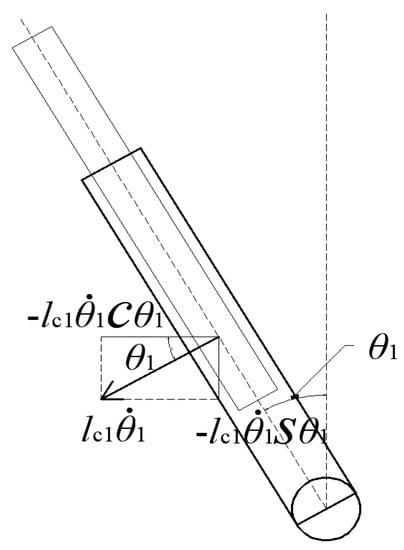 The constraining branch is composed of a revolute pair, a prismatic pair and a spherical pair. Its main rotational inertia and the forces that affect it are concentrated on the cylinder block and linear moving link of the prismatic pair. The revolute pair and spherical pair are ignored in the dynamic analysis. The coordinate system 1 where the revolute pair axis is located was chosen as the reference coordinate system. The schematic diagram of linear velocity and angular velocity of the constraining branch’s cylinder block is shown in Figure 8, and the relationship between them and constraining branch velocity parameters is shown in Equation (15)