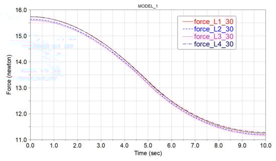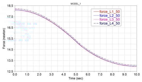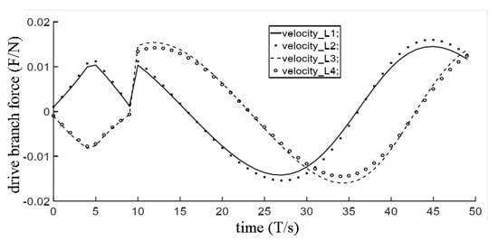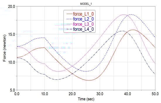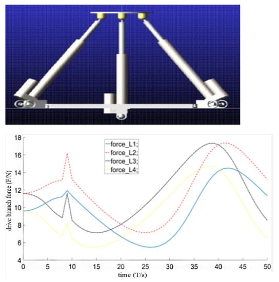 Whether the theoretical analysis was correct or not needed to be verified by simulation or experiment, and the virtual prototype model was imported into ADAMS simulation analysis software. The virtual prototype model was imported into Adams and the spatial drive was applied to the moving platform to make the moving platform move when only affected by gravity, according to the motion equations of hypothesis 1. The force simulation solution of the driving branch is shown in Figure 16.