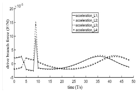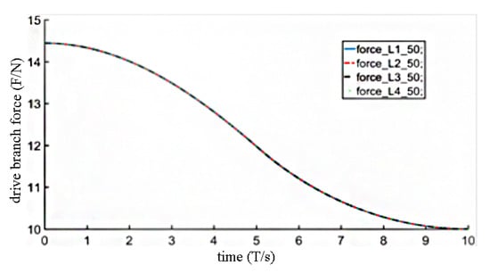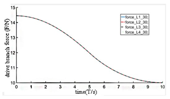 The other external forces on the moving platform were . The external moment was 0. The numerical solution was calculated with MATLAB, and the stress diagrams of four driving branches were obtained, as is shown in Figure 15. The analysis showed that in the linear motion stage, the forces on the driving branch L1 and the driving branch L4 decreased smoothly, and the forces on the driving branch L2 and the driving branch L3 increased smoothly. The force curves of the driving branch L1 and the driving branch L4 changed similarly and had different sizes, and the driving branch L2 and the driving branch L3 changed similarly and had different sizes. This result was consistent with the symmetrical structure design of the parallel grinding robot. In the circular motion stage, the forces on the four driving branches changed in sine and cosine waves and also met the qualitative law in the linear motion stage, which was consistent with the spatial motion. During the entire movement, the forces on the four driving branches were uniform. The minimum forces on L1 and L2 were 6 N near the 26th second, and the minimum forces on L3 and L4 were 6 N near the 15th second. The maximum forces on the four driving branches appeared near the 40th second, which was about 17.5 N, but the forces on the four driving branches changed slightly near the 10th second, that is, in the moment connecting the linear motion and circular motion, the forces affect the parallel grinding robot suddenly changed. This corresponded to the sudden change in acceleration in acceleration analysis. In the later trajectory planning and grinding process, the impact should be reduced.