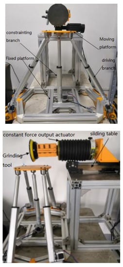 Parallel robots’ mechanisms are advantageous due to their large mass–stiffness ratio, small cumulative errors, high precision and suitability for high speeds and heavy loads [,,]. They are very suitable for the grinding industry. However, the development and application of parallel robots have been limited because of the easy coupling of grinding forces produced by parallel robots and complex spatial motion and control of parallel robots. In this paper, a new 5-degrees-of-freedom (5-DOF) parallel robotic grinding system is designed. The proposed 5-DOF parallel robot, combined with the constant force output actuator produced by a company in Austria called Ferrobotics, has a force decoupling design and produces a constant force to grind objects.