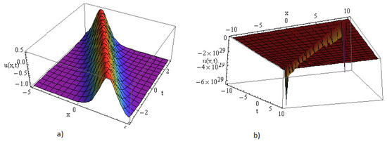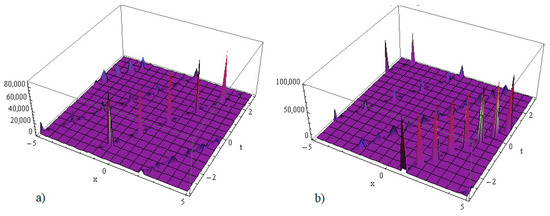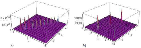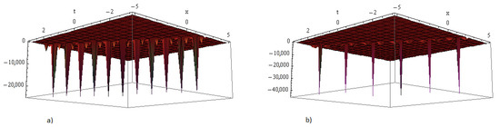 If we considered bigger values for the two constants, and , the solution profile (78) changed. It took the form of periodic peaks propagating in time and along the x-axis. The peaks could have unbounded amplitudes and a periodicity depending on the effective values of and . This behaviour is illustrated by the two specific solutions plotted in Figure 2. In principle, bigger values of the constants , led to decreased wave periods and amplitudes. We noticed that the amplitudes changed from ∼ in Figure 1b to ∼ in Figure 2.