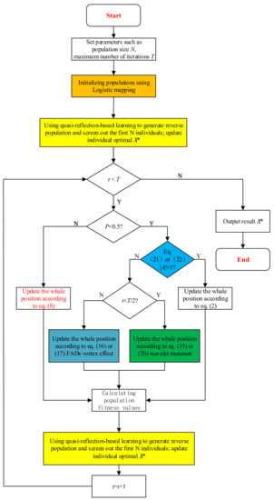 To address the above drawbacks and to improve the performance of the algorithm, on the one hand, domestic and foreign researchers have proposed many relevant improved WOA algorithms by using many strategies, such as changing operators [9,10,11,12], fusing chaotic mappings [13,14,15], and mixing other algorithms with the WOA algorithm [16,17,18,19]. For example, a Cauchy mutator was introduced into WOA to vary the individual movement step of whales through the Cauchy inverse cumulative distribution function method [9]; the combination of lens imaging backward learning and optimal worst backward learning strategies were used to improve the quality of swarm individuals [10]. Both the convergence factor and inertia weights were modified by introducing nonlinear strategies to balance the ability of the algorithm between the global exploration and local search, and accelerate the convergence speed of the algorithm [11]. Through differential evolution and Levy mutation, the algorithm was expanded the range of each search and enhanced the global search capability [12]. On the other hand, by introducing Iterative mapping and nonlinear fitting into the algorithm, the initial diversity of the swarm is ensured, while balancing the global search ability and local search of the algorithm to some extent [13]. By introducing Gauss chaos mapping [14] and Singer chaos mapping [15] into the algorithm, it is further demonstrated that chaos mapping has a good improvement effect on the WOA algorithm. In addition, mixing other algorithms is a common strategy in WOA improvement, and combining local search strategies, it can effectively reduce the occurrence of WOA algorithms falling into local optimum situations. For example, by mixing with algorithms, such as slime mould algorithm (SMA) [16], social group optimization (SGO) [17]., teaching-learning-based optimization (TLBO) [18], particle swarm optimization (PSO) [19,20], bat algorithm (BA) [21], and grey wolf optimizer (GWO) [22], it not only reduces the occurrence of falling into local optima, but also solves the problems of insufficient search capability and low efficiency of WOA when high-dimensional problems exist, which is of high use for the performance improvement of WOA algorithms.