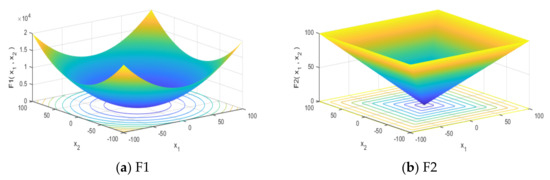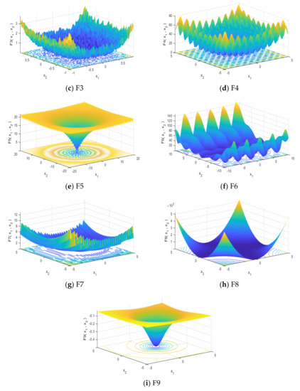 To test the performance of the improved algorithm, the experiment selects nine benchmark functions that are more representative for testing, as shown in Table 1: F1–F3 for unimodal (UM) function; F4–F7 for multi-modal (MM) function; F8-F9 for composition (CM) function. From the 2D forms of nine benchmarks as shown in Figure 3a–i, it can be seen that the UM function has only one optimal solution and is often used to test the algorithm’s ability to find the optimal solution. Since the MM function has multiple optima, it is difficult to find globally optimal solutions for these functions, but it can be used to test the algorithm’s ability to explore and jump out of local optima by broking the symmetry of iterative routes. The CM function also has a large number of optimal solutions, but it can be used to test the stability of the algorithm, since the optimal solution is easily found due to the low dimensionality. The tests are done in an experimental environment of CPU Inter(R) Core (TM) i7-8700, RAM 16 GB, and MATLAB.