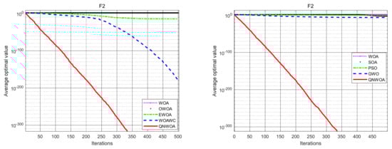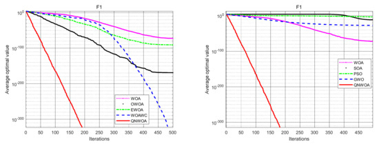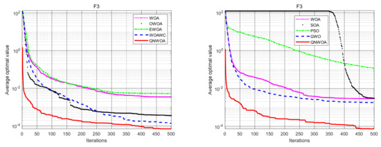 In our experimental tests, the algorithm parameters are set as shown in Table 2, and all algorithms run 30 times repeatedly on each function to record and count the optimal value (Best), mean value (Mean) and standard deviation (SD) run results, as shown in Table 3 and Table 4. By analyzing the experimental statistical results, it can be seen from the data in Table 3, combining with the lefts of Figure 4, Figure 5 and Figure 6, that both QNWOA and WOAWC converge to the minimum value in the UM function F1, but the convergence speed of QNWOA is much higher than several other algorithms, and QNWOA outperforms other algorithms, in terms of convergence speed, optimal value, mean and standard deviation in F2 and F3. Further, it can be seen from Table 4 that QNWOA outperforms several other swarm intelligence algorithms in F1–F3, in terms of the mean and standard deviation of optimal values. In summary, QNWOA in the UM function has a higher search capability compared to several other algorithms.