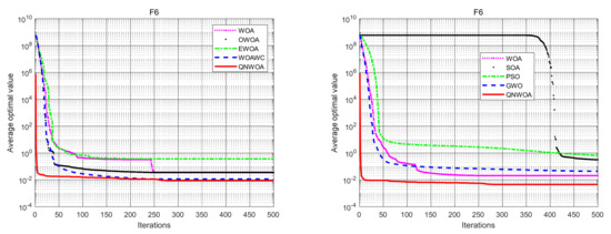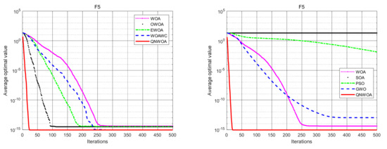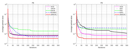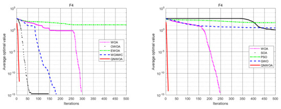 From the data in Table 3, combined with Figure 7, Figure 8 and Figure 9, we can see that QNWOA and WOAWC in the CM functions, F4 and F5, have significantly better optimal values, mean values, and standard deviations compared with other improved WOA algorithms, while QNWOA is much faster than WOAWC in terms of convergence speed. The improvement in the optimal value is especially large. From Table 4, it can be seen that the QNWOA proposed in this paper outperforms the other three group intelligence algorithms compared in all data, especially in terms of optimal values. It proves that the improved QNWOA effectively avoids the local optimum in the CM function and has a better global capability.
