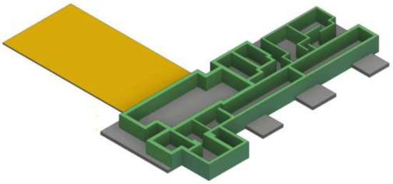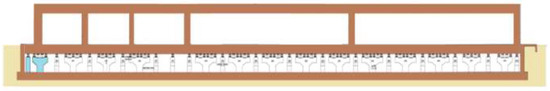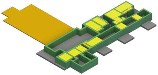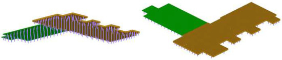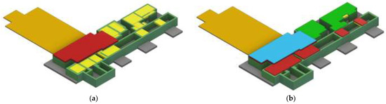 Geometric modeling of the Gamma + Laser platform with radiation protection walls and radiation protection ceilings (plus roofs) was performed based on the 3D model (Figure 5). The ceilings are made of prefabricated reinforced concrete, mounted without gaps on the radiation protection wall system. The ceilings, located at a height of 5000 mm, are represented in yellow and the ceilings of the rooms with a height of 6500 mm are represented in red (Figure 6a).