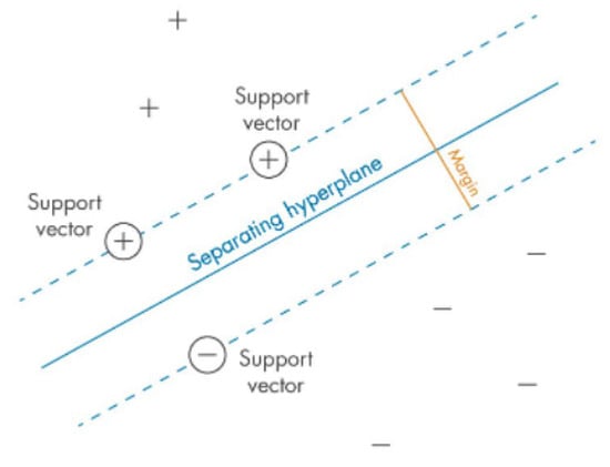 SVM technique is utilized to find a hyperplane in an N-dimensional space, where N is the number of features, that classifies the data points clearly. SVM finds the best hyperplane that has the largest margin between two classes. The support vectors are the closest data points to the separating hyperplane; these points are on the boundary as represented in Figure 1 with + indicating data points of type 1, and—indicating data points of type −1.