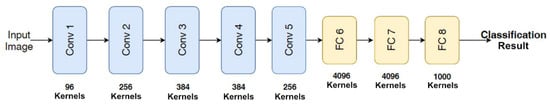 In the first stage AlexNet, a pre-trained CNN network is used as a feature extractor. In last few years, AlexNet has shown high performance [] and many studies have shown very good results in image classification [,,,,]. After AlexNet was introduced, Artificial Intelligence (AI) society that studies on image recognition-based classification has focused much more on CNNs and has improved AlexNet’s performance by altering some parameters or number of layers, making it deeper [,,]. AlexNet combines the benefits of Inception-V4 and ResNet50, which can quickly initialize the network model and maintain good network generalization performance. In experiments, it is apparent that there are certain disadvantages to VGGNet. One issue is that it is slow to train. Furthermore, the weights of the network architecture considering disk and bandwidth are quite large. So, AlexNet is better suited for most image classification problems []. This is the reason AlexNet is utilized in this study.