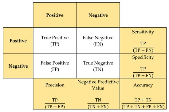 Taking all the correct classified samples into account, accuracy, precision, F1 score, sensitivity and specificity criteria can be calculated through Equations (23)–(27), respectively.