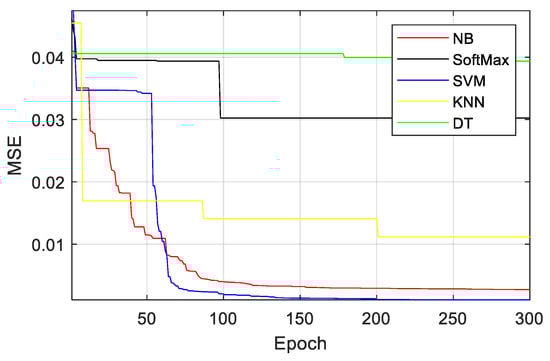 Furthermore, the variation of mean squared error of the classifiers versus number of epochs are presented in Figure 6.