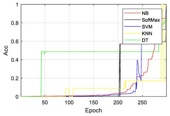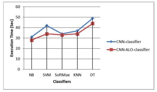 In addition, the variation of accuracy versus number of epochs is provided in Figure 7. Experimental results show that NB classifier presented best results compared to other approaches (SVM, SoftMax, KNN, DT). Furthermore, the execution times for these classifiers are also acquired and visualized in Figure 8.