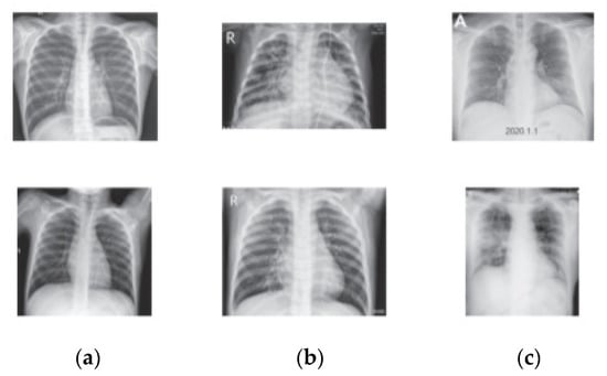 On the other hand, COVID-19 public dataset in [] is also used to validate the proposed method. This dataset consists of 460 COVID-19, 1266 normal, and 3418 pneumonia training X-ray images and 116 COVID-19, 314 normal, and 855 pneumonias for testing. The main critical issue in this dataset is that it contains pneumonia that is caused by bacterial infection and not COVID-19. Figure 9 illustrates images that are randomly selected from the class samples.