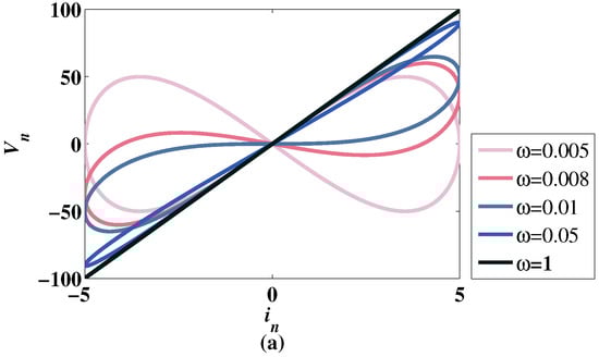 Different curves with different frequencies are shown in Figure 1. When the frequency increases gradually, the nonlinear relationship between current and voltage decreases. When , the voltage increases linearly with the current. Figure 1 shows that model (7) conforms to the characteristics of the memristor under the above parameter values.