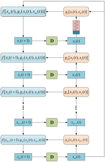 Different from the coupling mode in (8), when calculating the value of the current time of a dimension, in addition to considering the influence of the value of the previous dimension at the current time, the influence of the previous dimension on the previous iteration result is also added. By adding the time-delayed variables, the coupling degree is increased, and the complexity of the system is improved.