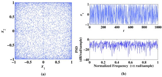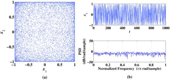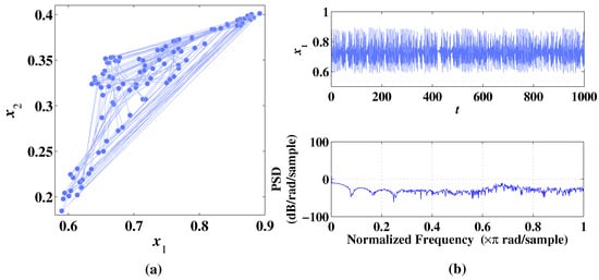 As shown in Figure 3a, the 2D-CLS can generate a chaotic attractor in a small range of . In Figure 3b, the randomness of the sequence is reflected by the temporal diagram and frequency spectrum. The Lyapunov exponents at the chaotic state are , and , which proves that the 2D-CLS can generate a chaotic attractor under the condition of .