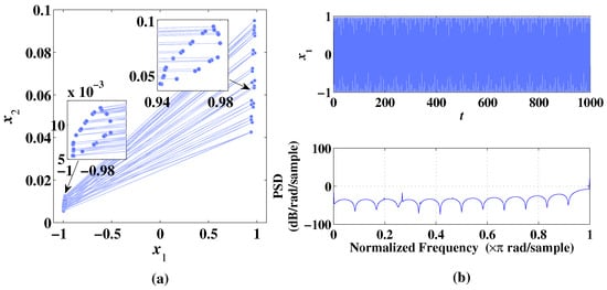 As shown in Figure 7a, when , the sequences generated by 2D-MCLS form a circular curve in the ranges of . As shown in Figure 7b, the temporal diagram and frequency spectrum show obvious periodicity. Additionally, the Lyapunov exponents are computed as , which proves that the 2D-MCLS is non-chaotic at this condition of parameters.