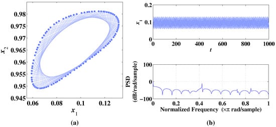 As shown in Figure 4a, when , two circular curves can be obtained by the 2D-CLS. As shown in Figure 4b, through the temporal diagram and frequency spectrum, it is concluded that the 2D-CLS system is in a periodic state. Calculate the Lyapunov exponents of 2D-CLS in this state as , which shows that 2D-CLS is non-chaotic under the condition of .