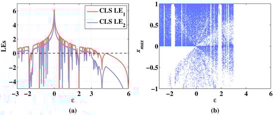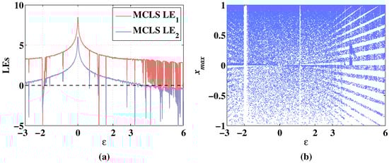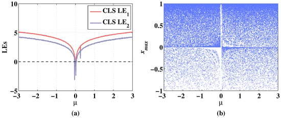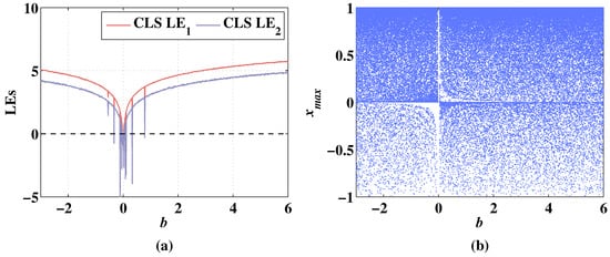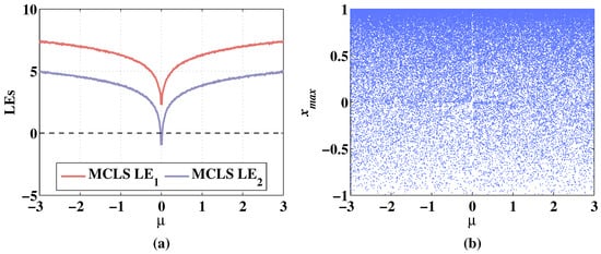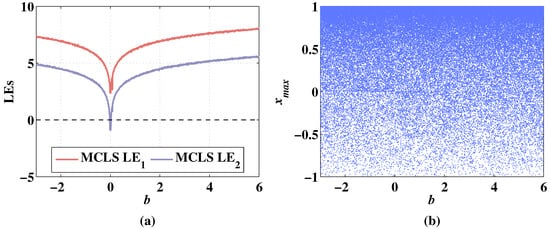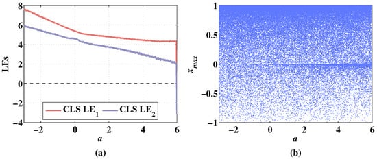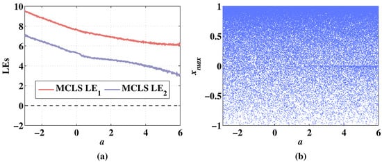 The Lyapunov exponents (LEs) can judge whether the system is chaotic or not. A positive Lyapunov exponent represents expanding nature, and the system is chaotic [36]. If there are two or more positive Lyapunov exponents, the system is hyperchaotic [37]. By calculating LEs with varying parameters, the evolution of systems with the variation of parameters can be accurately described [38,39]. Correspondingly, the bifurcation diagram can show the distribution change of the chaotic sequence with the change of the parameters directly. The dynamic performances of CLS and MCLS with changing parameters are analyzed in the following sections.