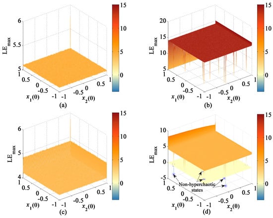 The range of initial values of the CLS and MCLS is . Take 300 points from the ranges and calculate the LEs as shown in Figure 17. According to Figure 17a,b, the values of the first LE are positive in the whole range. Additionally, the first LE of MCLS higher than the CLS’s except that LE of some initial value points is relatively low. Similarly, in Figure 17c,d, the second LE of MCLS is higher than that of CLS. However, in Figure 17d, the diagram of the second LE of MCLS displays some points that are under the zero plane and show negative values of the second LE, which explain that the MCLS is non-hyperchaotic.