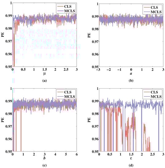 PE of 2D-CLS and 2D-MCLS with , . (a) Change of PE with parameter when , , . (b) Change of PE with parameter a when , , . (c) Change of PE with parameter b when , , . (d) Change of PE with parameter when , , .