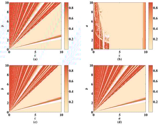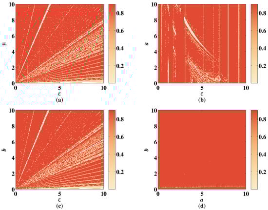 As shown in Figure 19a–c, the color distribution is relatively even, changing with parameters , a, and b, but the color is shallow in the right part of the figures due to the unstable parameter . The SE stays value when increasing the value of . In Figure 19b, when is set in the range , the SE value is low whatever a changes. In Figure 19d, the lower right corner shows the low complexity of CLS. These shallow regions are filled with deep color when adding the discrete memristor shown in Figure 20. The simulation result shows that under the influence of discrete memristor, the complexity of hyperchaotic sequence is improved, and the range of hyperchaotic system parameters is larger.