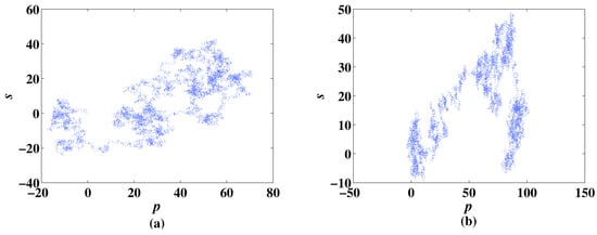 It can distinguish chaotic and non-chaotic states of sequences in binary form, in which denotes a chaotic state and denotes a non-chaotic state. Two variables and are calculated in the process of the 0–1 test to describe the motion track of the sequence. The track of the CLS system and the MCLS system with particulate parameter values are depicted in Figure 21a,b, respectively. The figures show that the track of the CLS and the MCLS system are both irregular, which reflects that the two systems are chaotic.