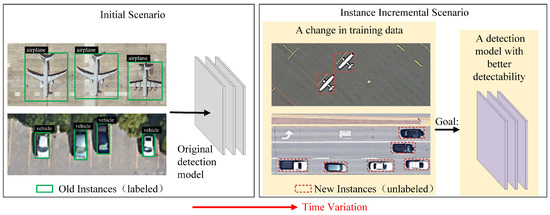 However, in the field of remote sensing, the classes of objects are relatively constant. The instance increment scenario in remote sensing object detection is common, but there is a lack of research. The instances of the same class provided by remote sensing satellites are ever increasing, and the feature diversity of an object is continuously enriched. The feature diversity of the objects of remote sensing images refers specifically to the diversity in color, size, resolution, background complexity, and other aspects, which stems from a myriad of factors, including imaging factors such as the imaging condition and imaging quality; environmental factors such as the weather, season, and geographic location; and intrinsic semantic factors, such as the shape and visual appearance. When the feature diversity of the old instance data is not enough, the trained model cannot adapt to the new instance well. As shown in Figure 1, the original detection model trains old instances in the initial scenario. When new instances are added to the training data, the detection model should fit the features of all the objects and demonstrate improved detectability after IL. Moreover, a mass of unlearned new instances are unlabeled and need to be manually annotated before being provided for IL.