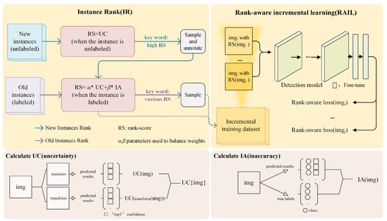 Method structure of RAIIL. The topmost two subfigures display the two parts, IR and RAIL, of RAIIL, respectively. In IR, for unlabeled new instances, the uncertainty (UC)-based rank-score is calculated using Formula (1) and ranked towards high rank-score values; for old instances, the UC- and inaccuracy (IA)-based rank-score is calculated using Formula (4), and old instances are ranked towards a diverse rank-score value. After new instances are labeled, they are rescored in terms of the UC- and IA-based rank-score. The two kinds of data finally construct an incremental training dataset after ranking and sampling. In RAIL, the loss function adopts a rank-aware loss (Formula (5)) when the model is fine-tuning. The bottom-most two subfigures display the calculation methods for the UC and IA, respectively. The UC is a comprehensive estimate of the model’s non-determinacy level with respect to the predicted results of the original image and the transformed image, while the IA is an estimate of the degree of non-coincidence with respect to the image’s predicted results and true labels.