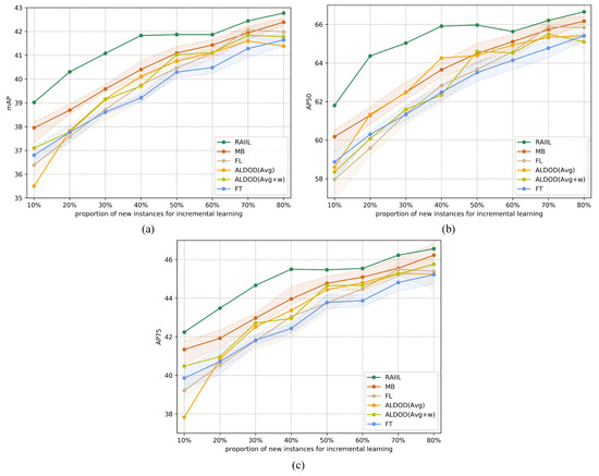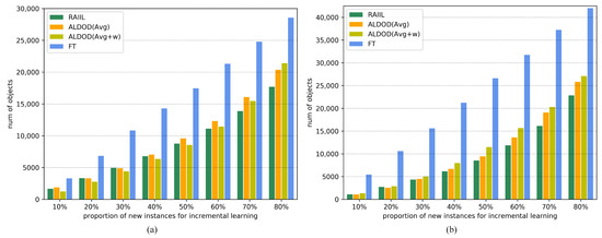 The statistical results are shown in Figure 6. From them, it can be seen that FT, which uses a random sampling strategy, has the largest number of labeled objects at various proportions. The two query and sampling strategies of ALDOD [19] significantly decrease the number of annotations, while in most cases, RAIIL selects the image that contains the smallest number of objects upon reaching the highest precision performance, which reflects the advantage of this method in terms of the labeling cost.