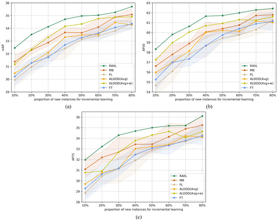 Like the existing incremental detection methods [14,15,16,17,18], this study also adopted the average precision (AP) as the metric of the instance-IL for object detection. The AP metric comprehensively estimated the precision of the classification and coordinate regression results over the test set. Specifically, three precision metrics of the COCO dataset [61] were adopted: