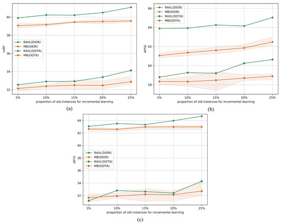 An additional experiment was conducted on DIOR and DOTA to further compare the performances of the two methods (MB and RAIIL) that need to preserve old instances. Figure 5 shows the precision results for the additional experiment at various proportions of old instances ranging from 5% to 25%, with the proportion of new instances fixed at 30%, close to the largest proportion of old instances. Of these two methods, RAIIL had higher precision in most settings, which further indicates that RAIIL has good performance.