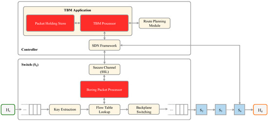 Other than conventional SDN functions, the SDN-TBM system adds three functional modules to enable the boring packet processing: boring packet processor (BPP), TBM processor (TBMP), and packet holding store (PHS), as shown in Figure 1 of the SDN-TBM architecture. BPP is included in each OpenFlow switch and plays the role of both packet-in message transmitter and boring packet resolver, while TBMP and PHS are extra modules added to the controller. TBMP is the core logic of SDN-TBM, which stores the to-be-delivered packets in PHS and generates boring packets. A to-be-delivered packet is the first packet in a flow, which is temporarily kept in the controller and is delivered when the tunnel has been completely set up. PHS is a database which stores the to-be-delivered packets and the relevant information, such as timestamp, action set, etc.
