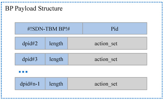Other than built-in SDN framework modules, such as the route planning module, SDN-TBM includes two more modules, packet holding store (PHS) and TBM processor (TBMP), as shown in Figure 1. TBMP communicates with built-in modules and stores the packet into PHS. TBMP is also responsible for generating a packet-out message, either containing a boring packet (BP) or a regular message. PHS stores to-be-delivered packets, including the information of the packet id, timestamp, action_set, and payload for each holding packet. As shown in Figure 2, PID denotes the packet identifier of the to-be-delivered packet, timestamp records the creation time, and action_set records the sequence of actions to be applied to the switch on the forwarding path. For each associated switch, there is an entry including a tag of boring packet, the switch identifier, dbid (or switch id), length of action-set, and action-set. The data structure of the boring packet contains the header portions, which are inherited from the original packet, and payload portions, which consist of tag, dbid, length, and actions, as can be shown in Figure 3.