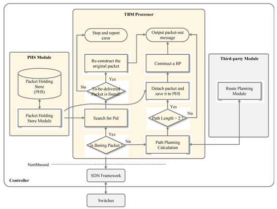 The TBMP module plays the central role of SDN-TBM, which performs the core logic for dealing with the packet management at the controller. When a packet is received by the controller, the step-by-step operations of TBMP are described in the following, as supplemented in Figure 4.