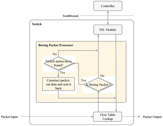 An SDN-TBM-enabled system requires the boring packet processor (BPP) to be included in each participating switch. BBP is a functional module that deals with packet-in and packet-out messages, particularly the boring packets. As shown in Figure 5, once a packet arrives at a switch, there is normal packet forwarding if it is matched packet. Otherwise, it fails in searching for a match in flow table, a packet-in message is generated and it is passed to BPP for boring packet inspection. If the arriving packet is not a boring packet, then it is simply forwarded to the controller and waits for a packet-out message sent from the controller. For the purpose of consistent processing, a packet-in message is always passed to the boring packet processor (BPP). When a packet-out boring packet is received by the switch, the switch retrieves the flow entry and updates the flow table. Accordingly, the boring packet is then forwarded to the next hop.