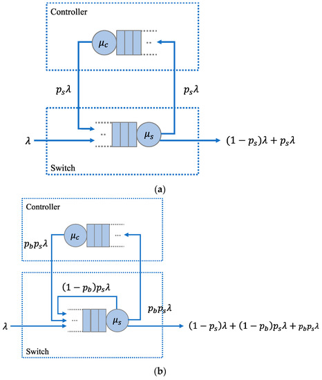 We first discuss the scenario of an EP arriving at a switch. For the conventional SDN network, as shown in Figure 6a, we assume that λ denotes the arriving rate of an EP arriving at a switch according to a Poisson distribution, represents the service rate of the switch, denotes the service rate of the controller, and represents the probability that a packet is forwarded to the controller. When an EP arrives at a switch and finds no flow entry matched in the flow table, it is forwarded to the controller . Otherwise, the EP is forwarded to the next hop .