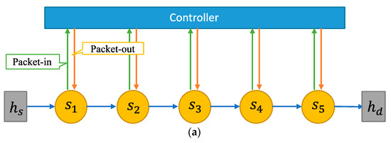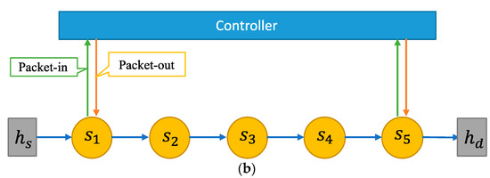 One other approach to reduce the number of packet-in messages is to adopt the concept of label switching as in MPLS [17,18,19,20]. Under the MPLS-based approach, routing information is encoded by the 12-bits VLAN identifier (VID). When a packet enters its ingress switch, it is encapsulated with multiple port numbers, which map to the forwarding switches on the route. Intermediate switches will use the VID to forward the packet to the next hop and delete the used header until the packet is delivered to its final destination. The VID field can record 3–5 hops. The scheme cannot need the controller service when receiving an unfamiliar packet, except for ingress switch. Therefore, it effectively reduces the number of packet-in messages. However, the switches may only forward packets (or flows) to designated ports but be unable to perform more actions for dealing with the packets. Consequently, the ability of forwarding the packet is restricted, such as changing the source or the destination MAC or IP addresses. Hence, even though the MPLS-based approach can solve the controller’s overloading problem, SDN features may not be fully implemented.