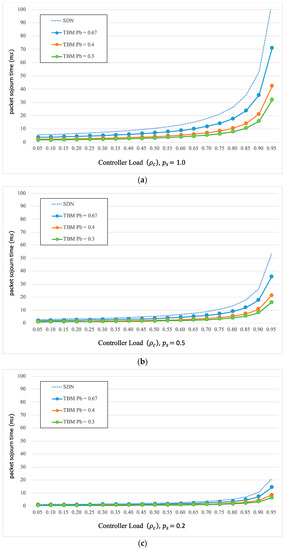 The first numerical experiment investigates the effects of and on the packet sojourn time in a single switch. Noted that represents the probability that a packet is forwarded to the controller, and represents the probability of forwarding the non-boring packets (BPs) to the controller. The work of [2,14] indicated that the distribution of the number of switches on a path in a data center is {3, 5, 7}. Therefore, we vary the values of as {0.67, 0.4, 0.3}. We also vary the values of as {1.0, 0.5, 0.2}. Because the load ratio of the controller will affect the packet sojourn time, we vary the controller load ratio from 0.05 to 0.95 by an incremental 0.05. We compare the proposed SDN-TBM approach to the conventional SDN approach proposed by Pranata et al. [15]. The numerical results are shown in Figure 8a–c. From Figure 8, one can see that for a fixed value of , the average packet sojourn time increases as the controller load ratio increases. For a fixed and a fixed controller load ratio, the average packet sojourn time in a switch decreases as the value of decreases. One also can find that, from Figure 8, our approach outperforms the SDN approach. For example, in Figure 8a, when the controller load ratio approaches 95%, the average packet sojourn time drops significantly by approximately 70%, 60%, and 33%, and the average packet sojourn time is approximately 54%.